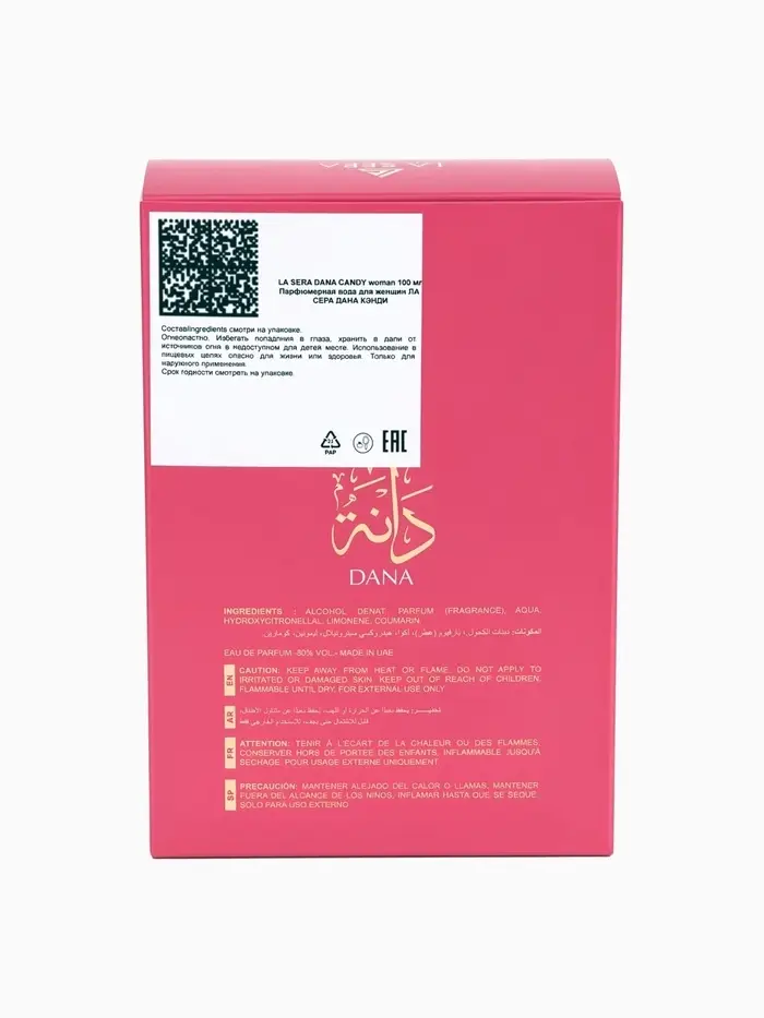 Парфюмерная вода La Sera DANA CANDY — это женственный и современный аромат, вдохновлённый мотивом Arabia Haya Crush, выпущенным в 2024 году. Этот аромат создаёт неповторимое ощущение сладости, игривости и утончённой элегантности, подчеркивая индивидуальность и харизму своей обладательницы.