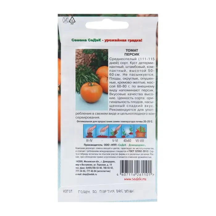 Среднеспелый (111-115 дней) сорт. Куст детерминантный, штамбовый, компактный, высотой 50-60 см. Не пасынкуется. Плоды, округлые, опушенные, кремово-желтые, массой 60-80 г, по внешнему виду напоминают персик. Вкусовые качества высокие. Ценность сорта: оригинальность плодов, насыщенный сладкий вкус. Рекомендуется для употребления в свежем виде и цельноплодного консервирования.