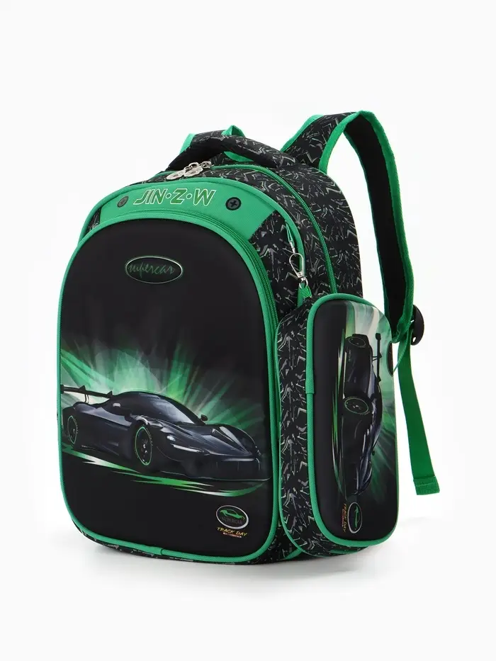 Рюкзак школ. с Эргон. спин. 30*12*36 см, 2отд, 2н/карм+Пенал, мальчик, Машина, черн/зел