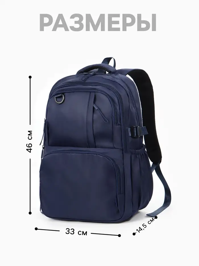Рюкзак школьный, однотонный, 2 отделения, 6 карманов, 33×14.5×46 см, синий