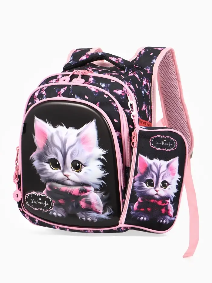 Рюкзак школ. с Эргон. спин. 29*14*38 см, +Пенал, девочка, Кот, черн/роз
