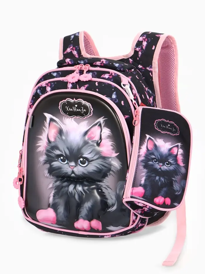 Рюкзак школ. с Эргон. спин. 29*14*38 см, +Пенал, девочка, Кот, черн/роз
