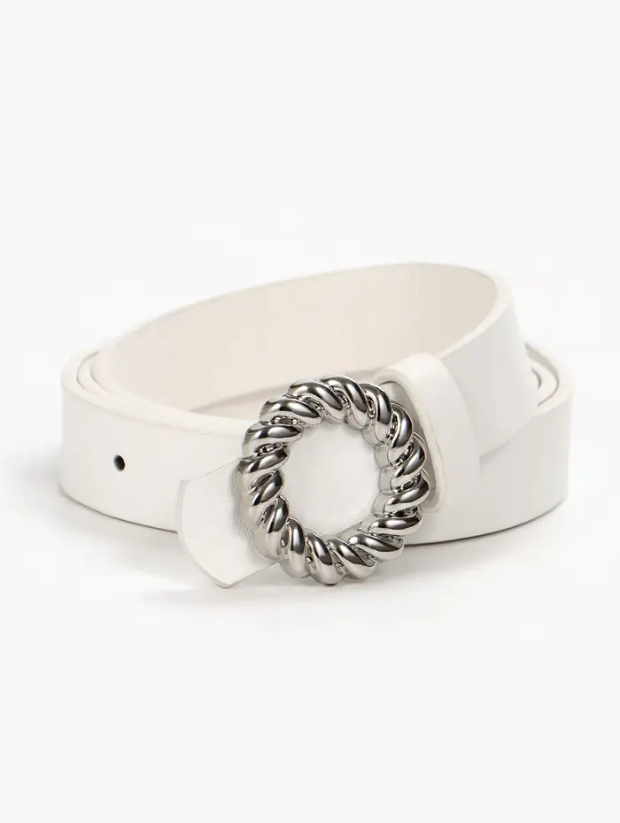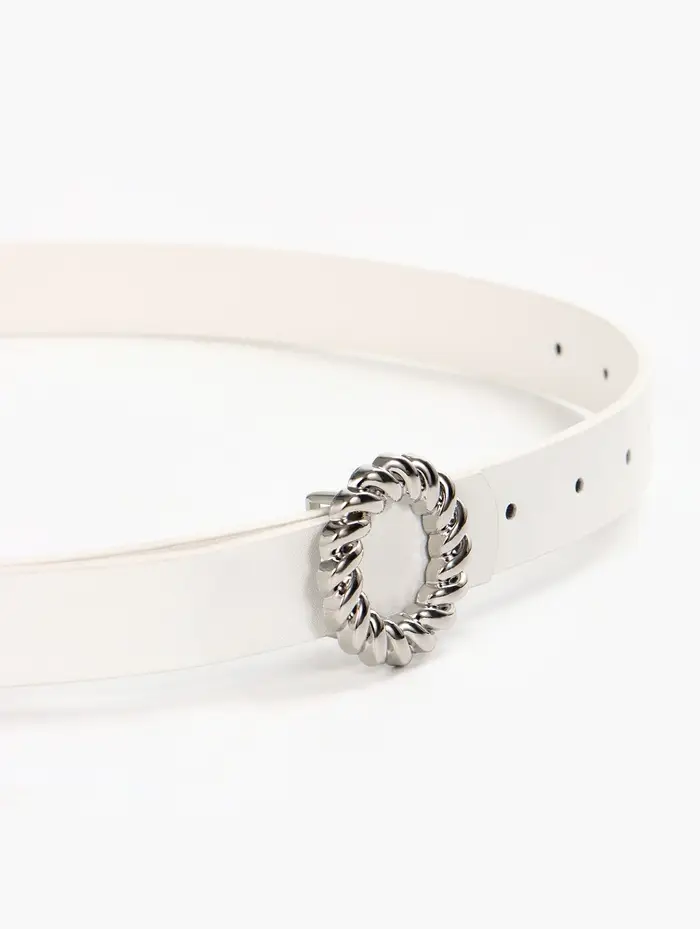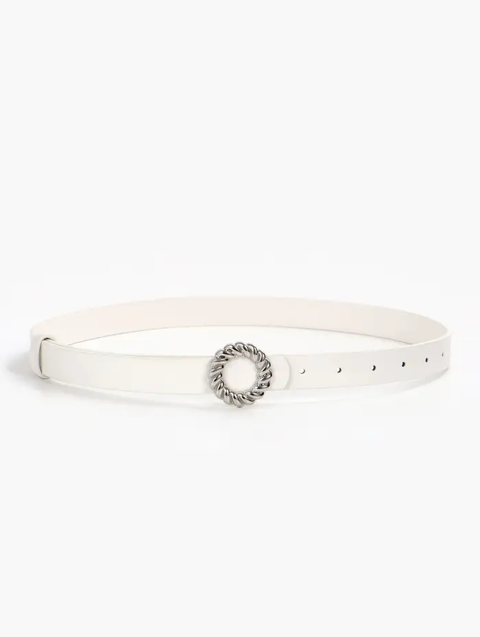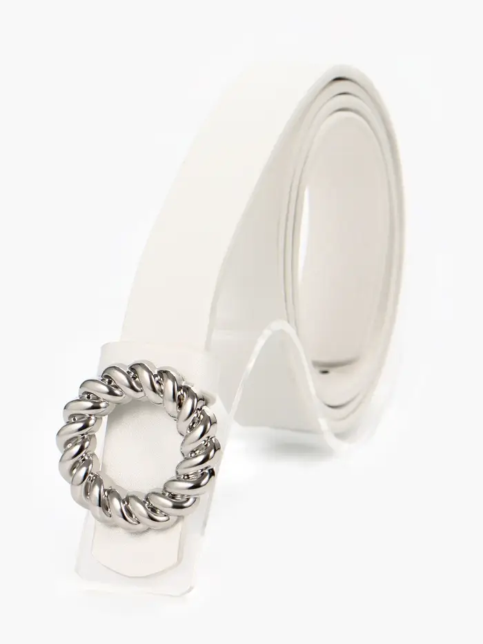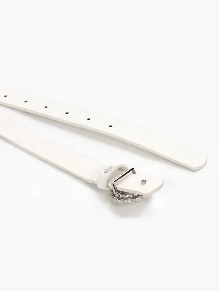 Этот белый ремень — тот самый аксессуар, которого не хватает в вашем гардеробе. Он не просто держит брюки, а завершает образ, добавляя ему лёгкости и стильной строгости. Узкая ширина и классическая серебряная пряжка-затяжка делают его универсальным спутником для юбок, платьев и джинсов.