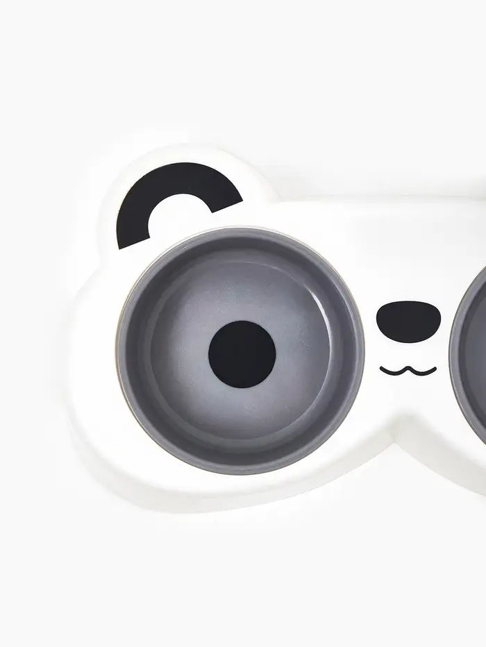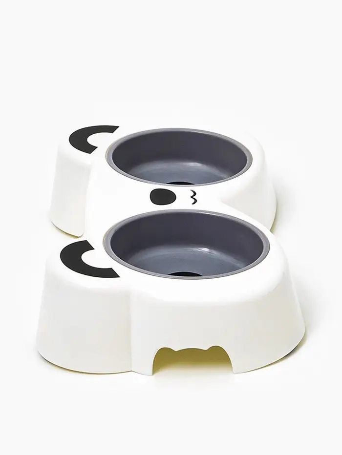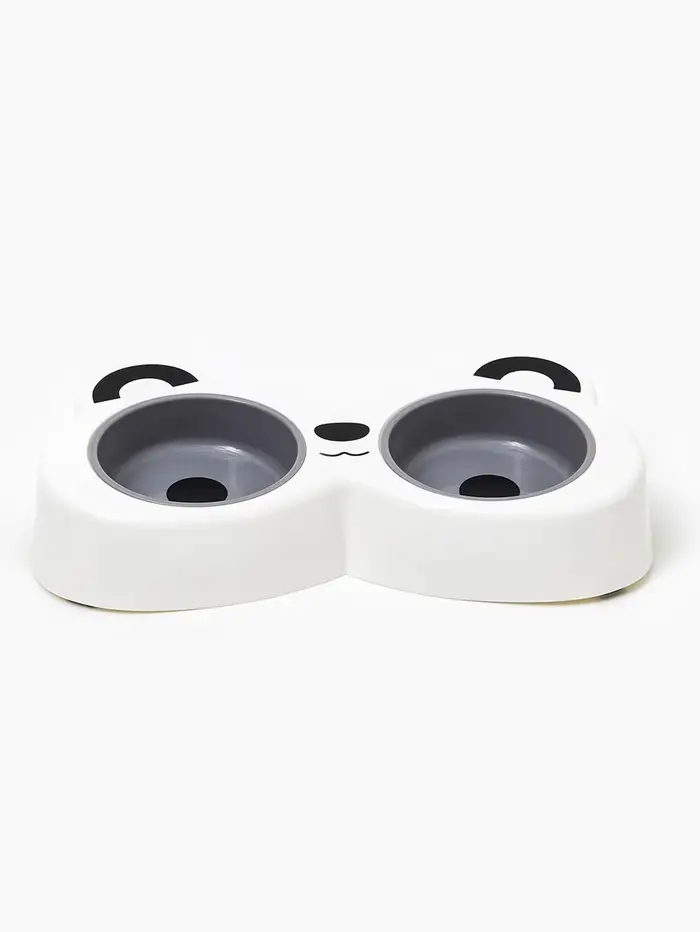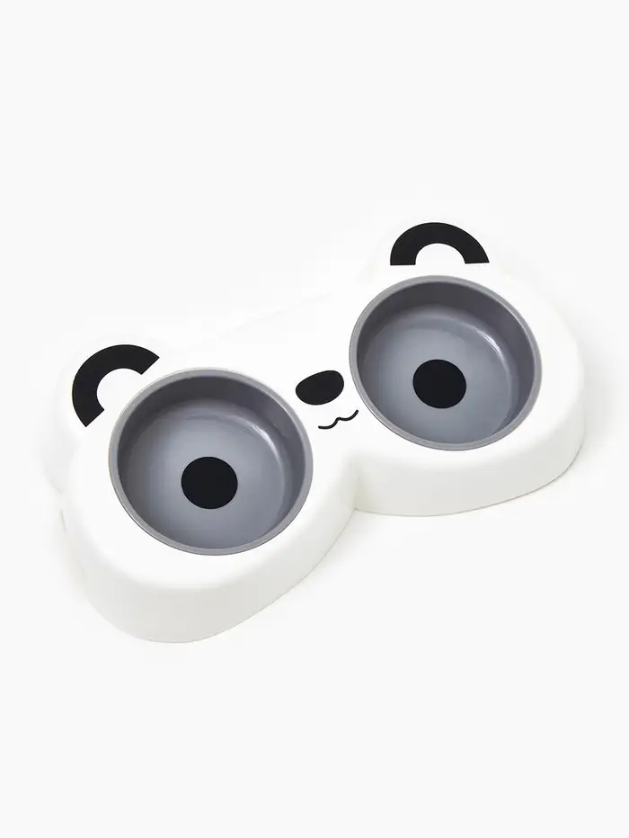 Двойная миска объединяет функциональность и милый дизайн: два круглых отсека по 160 мл на общей подставке с чёрно-белым принтом панды. Белый и серый цвета выглядят свежо и нейтрально, подходя как для кошек, так и для мелких собак.