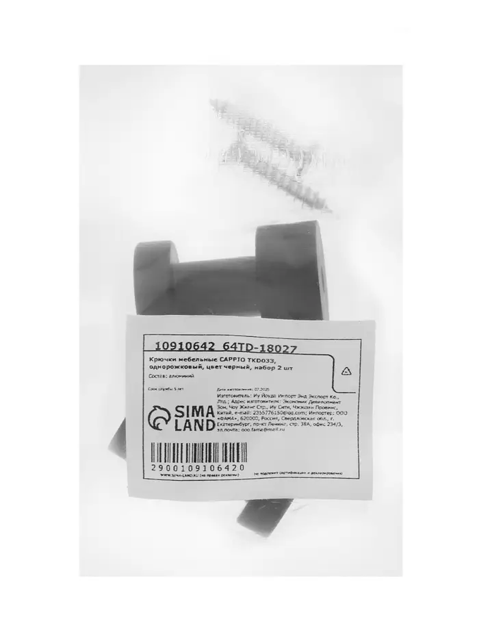 Крючки мебельные CAPPIO TKD033, однорожковый, цвет черный, набор 2 шт