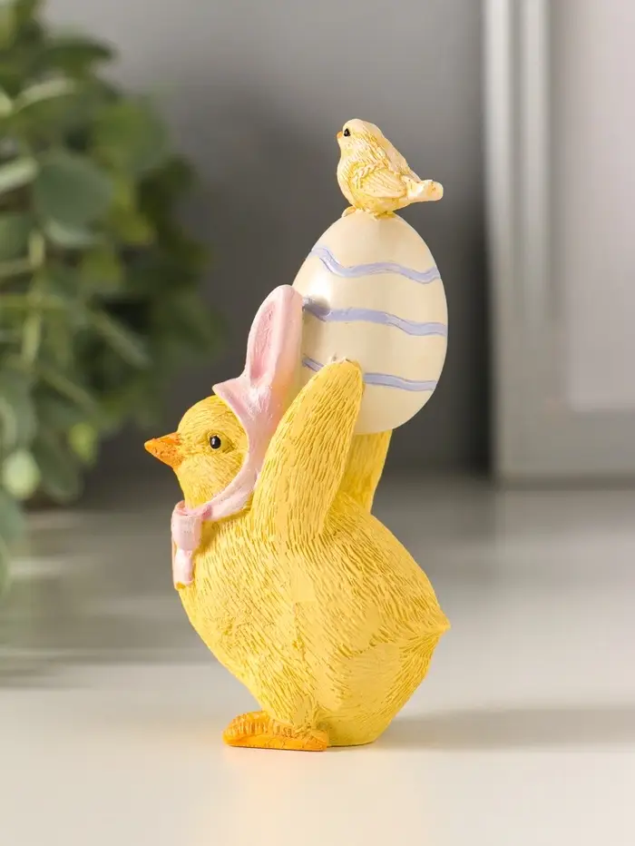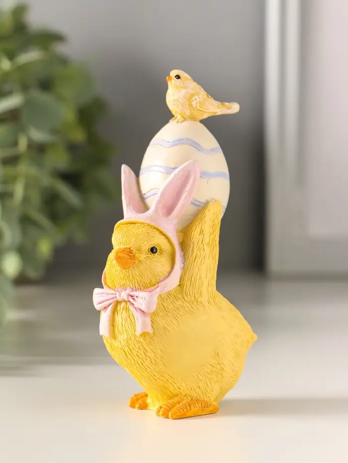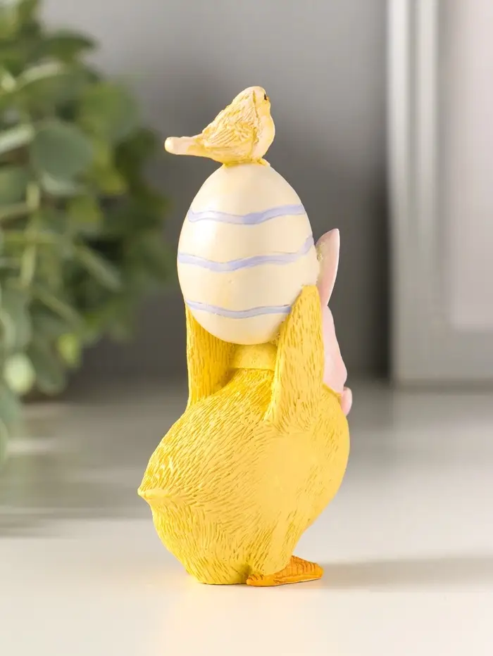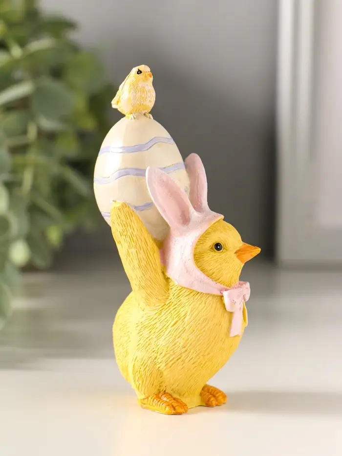 Сувенир полистоун "Цыплёнок в розовой шапке с заячьими ушками несёт яичко" 10,5 см