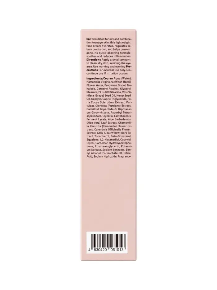 Лёгкий крем разработан специально для потребностей подростковой кожи. Он быстро впитывается, не утяжеляет и помогает регулировать выработку кожного себума, снижая жирный блеск. Формула направлена на уменьшение воспалений и покраснений, способствует успокоению кожи и поддерживает её комфортное состояние в течение дня.