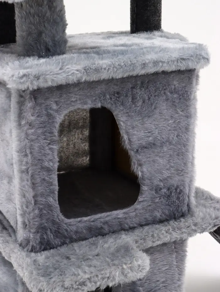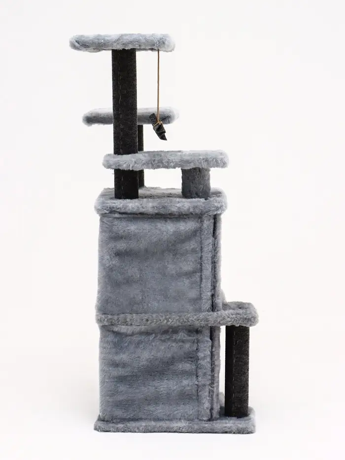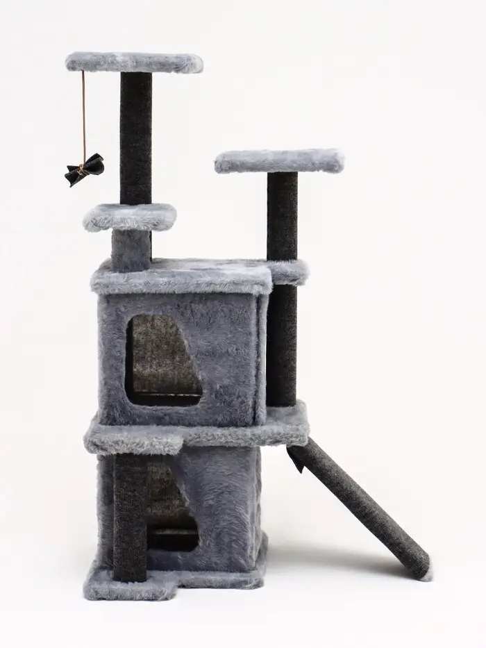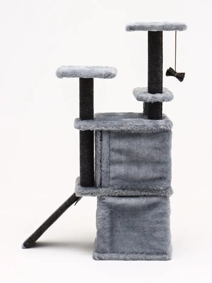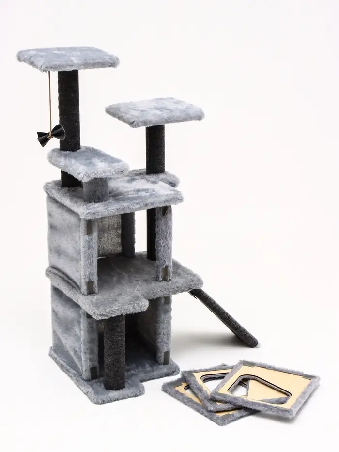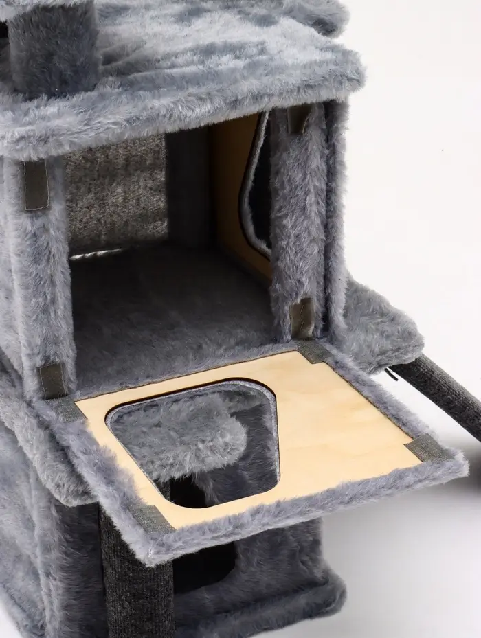- Многоуровневый комфорт: устойчивые полки и когтеточки — каждый элемент отвечает естественным потребностям кошки. Любительница высоты получит свою смотровую площадку, а засоня — мягкое укрытие с бортами.