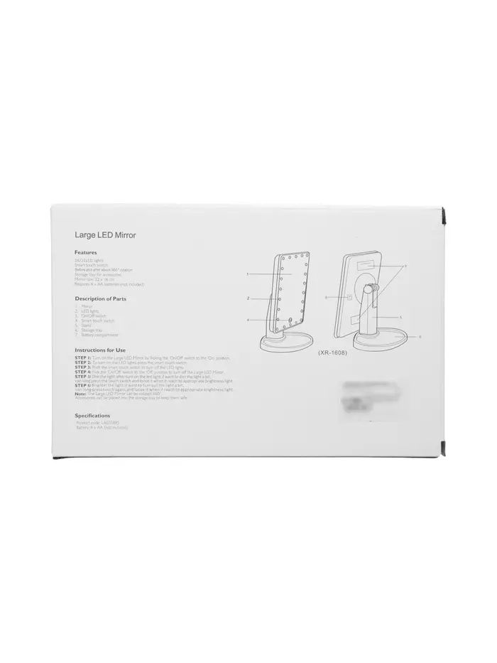 Зеркало с подсветкой KZ-06 размером 26.5 × 16 × 12 см оснащено 22 светодиодами и сенсорной кнопкой для удобного включения подсветки. Работает от 4 батареек AA, корпус выполнен из пластика, зеркало — стеклянное.