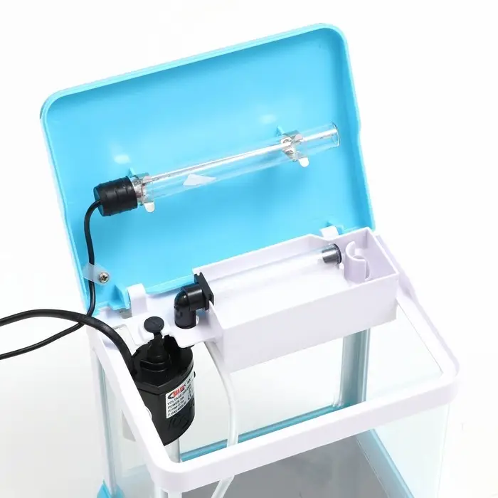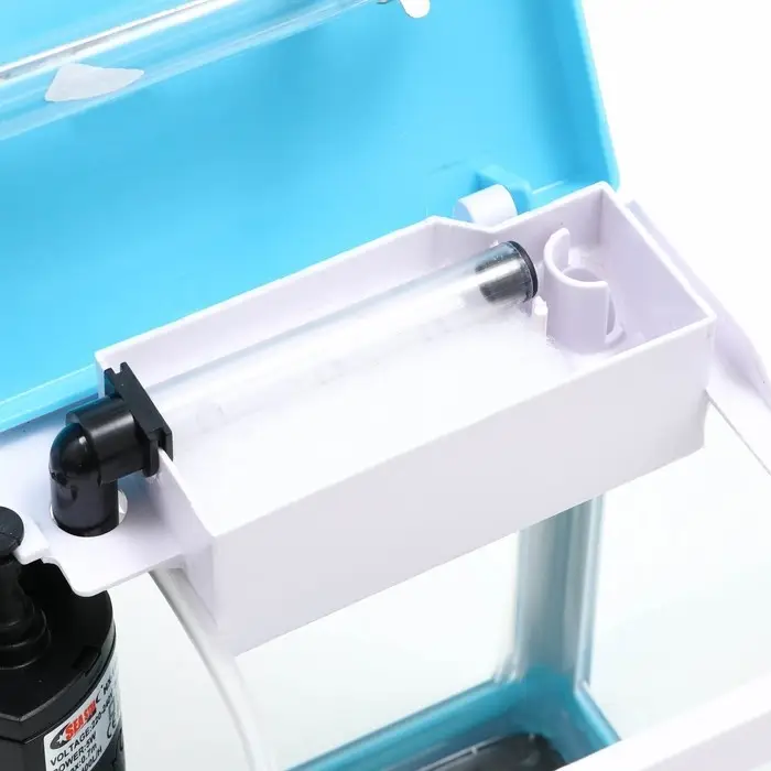 Полезный объем аквариума составляет 3.5 литра. Аквариум полностью готов к работе. Фильтр и светодиодная лампа встроены в крышку аквариума.