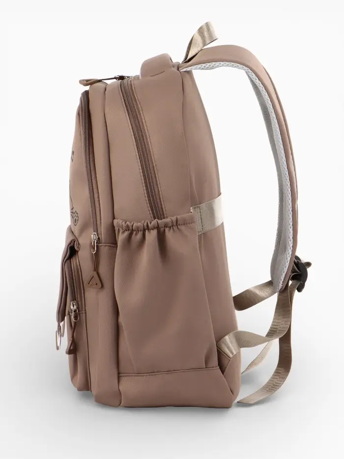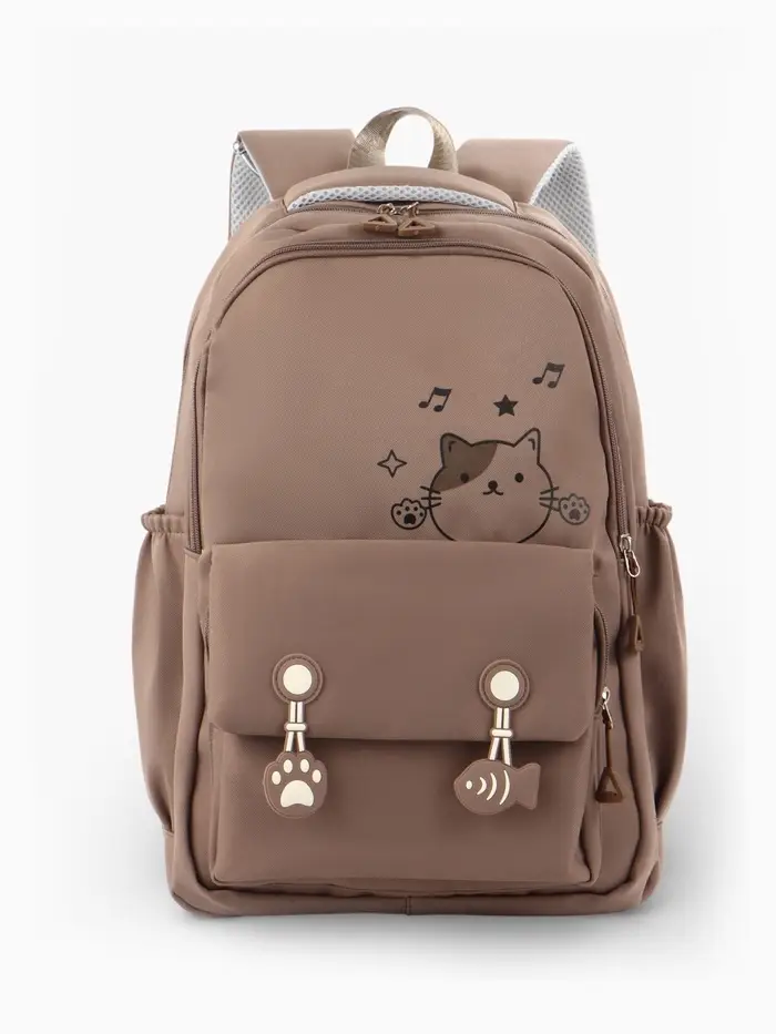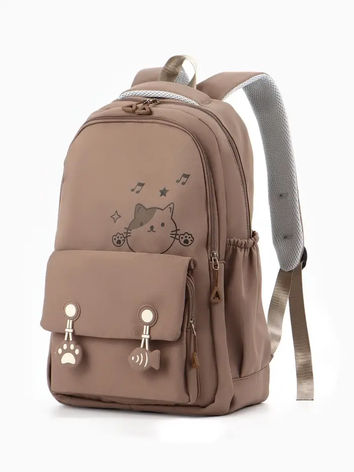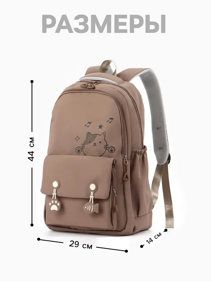 Этот бежевый рюкзак с котиком станет верным спутником для школьницы средних и старших классов. Мягкая спинка и продуманная форма делают его носку комфортной даже с полной загрузкой тетрадей и учебников. Объёма в 15-20 литров достаточно для всего необходимого, а три внешних кармана помогают быстро найти телефон, ключи или пропуск.