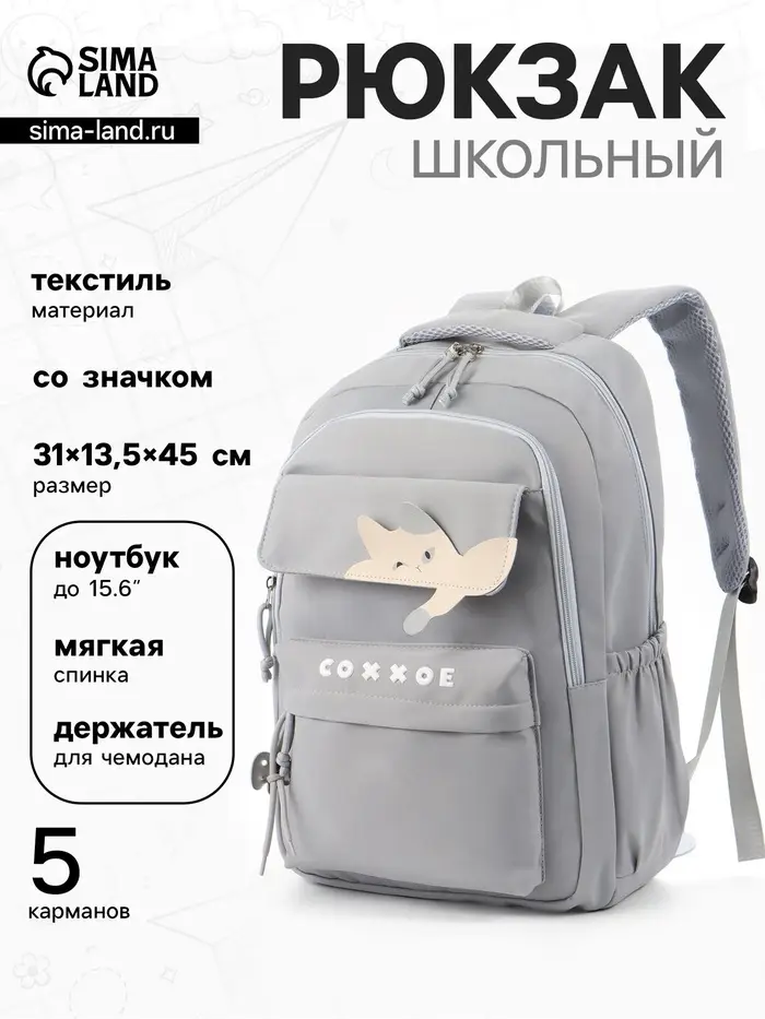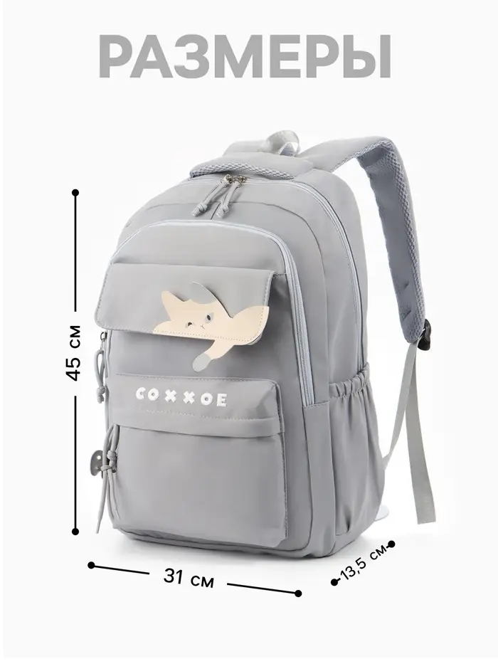 Рюкзак школьный, «Уставший кот», 5 карманов, 2 отделения, 31×13.5×45 см, серый