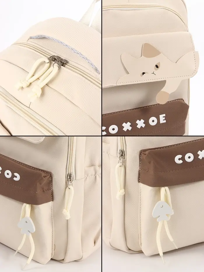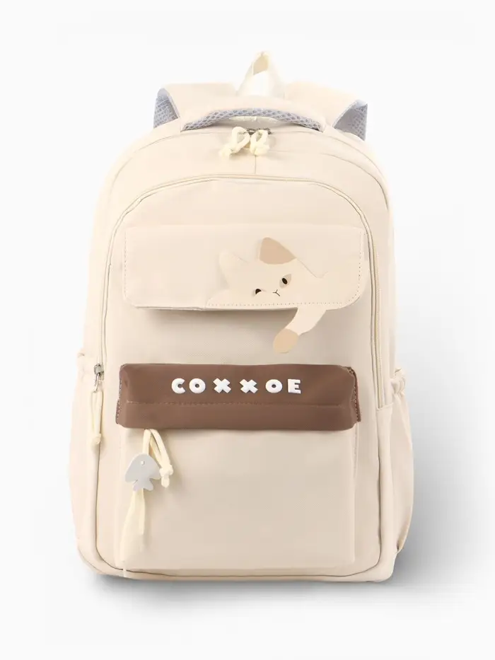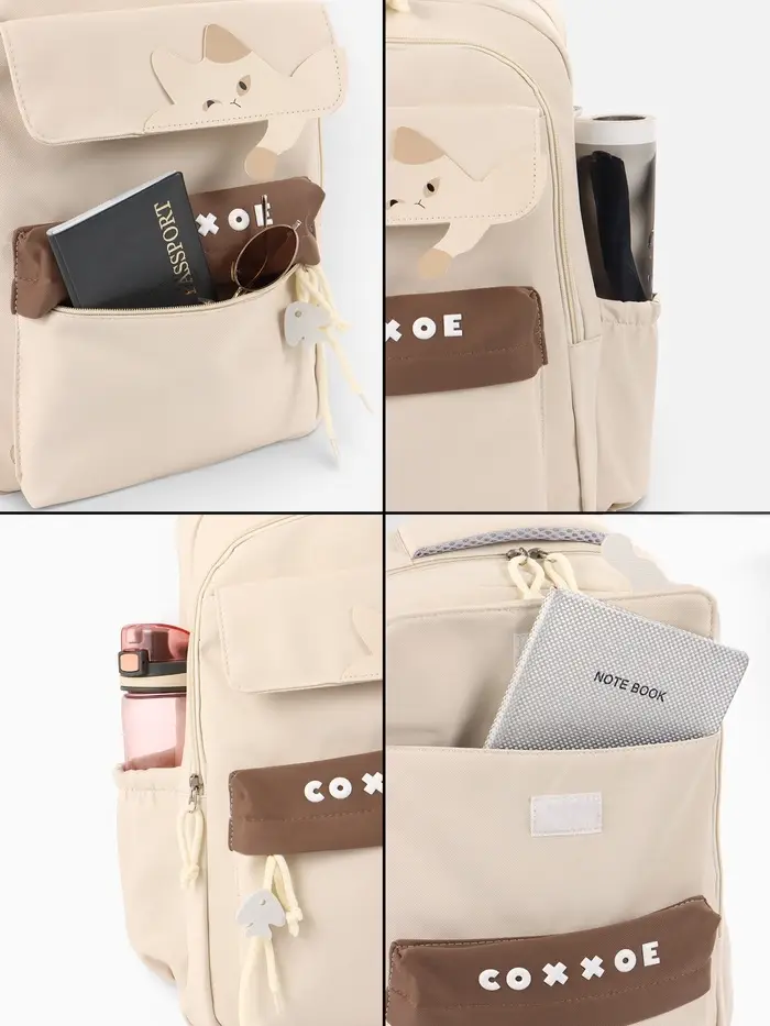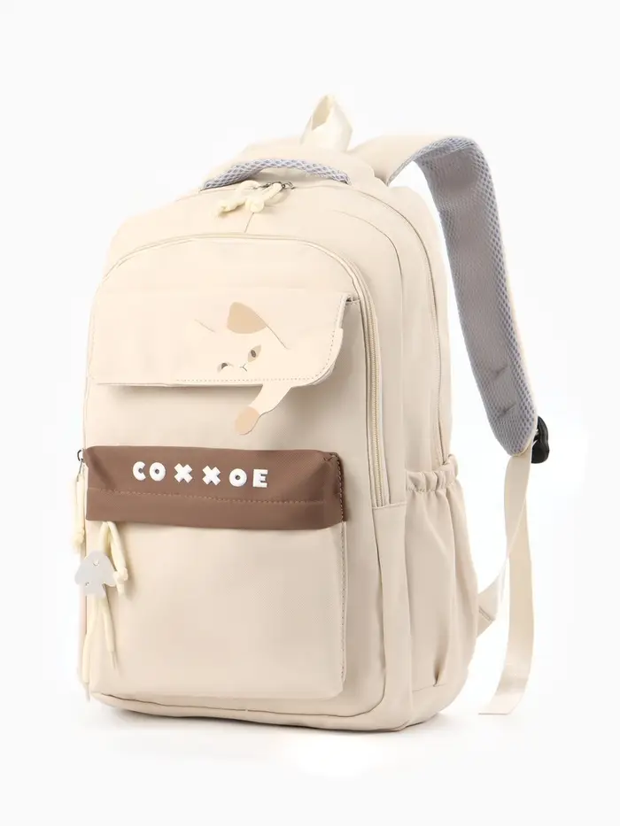 - Прочный текстиль бежевого оттенка практичен в носке, а милый рисунок с котёнком добавляет индивидуальности.