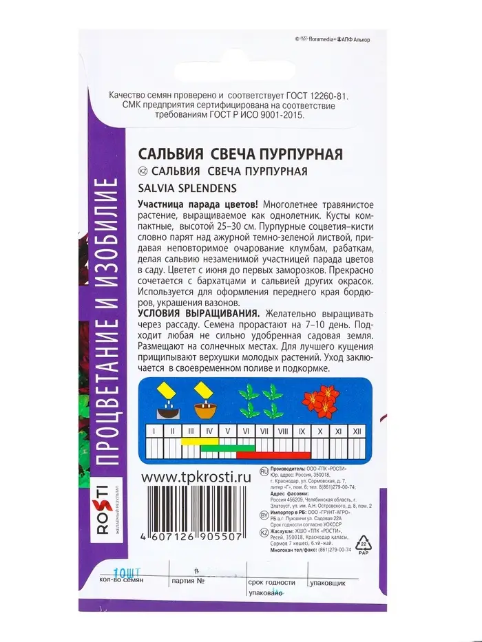 Участница парада цветов! Многолетнее травянистое растение, выращиваемое как однолетник. Кусты компактные, высотой 25-30 см. Пурпурные соцветия-кисти словно парят над ажурной темно-зеленой листвой, придавая неповторимое очарование клумбам, рабаткам, делая сальвию незаменимой участницей парада цветов в саду. Цветет с июня до первых заморозков. Прекрасно сочетается с бархатцами и сальвией других окрасок. Используется для оформления переднего края бордюров, украшения вазонов.