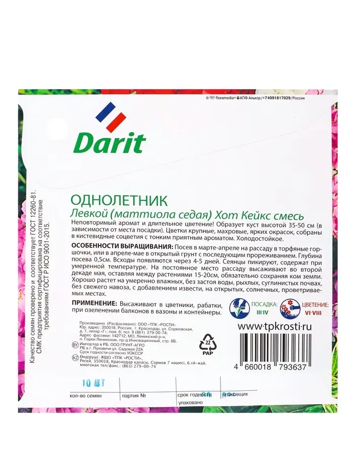 Семена цветов Левкой маттиола "Хот Кейкс" смесь, О, 15 шт