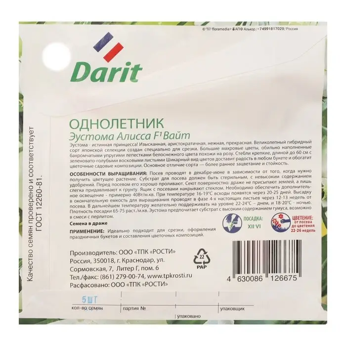 Семена цветов Эустома "Эхо" Белая F1, О, драже 10 шт