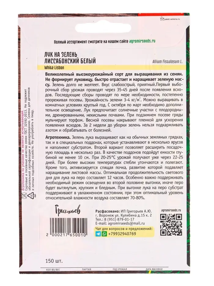 Семена Лук на зелень Лиссабонский Белый (White Lisbon) 150шт. 12.29 г.