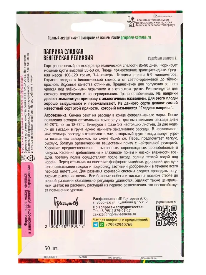 Семена Паприка сладкая Венгерская Реликвия 50 шт. 12.28 г.