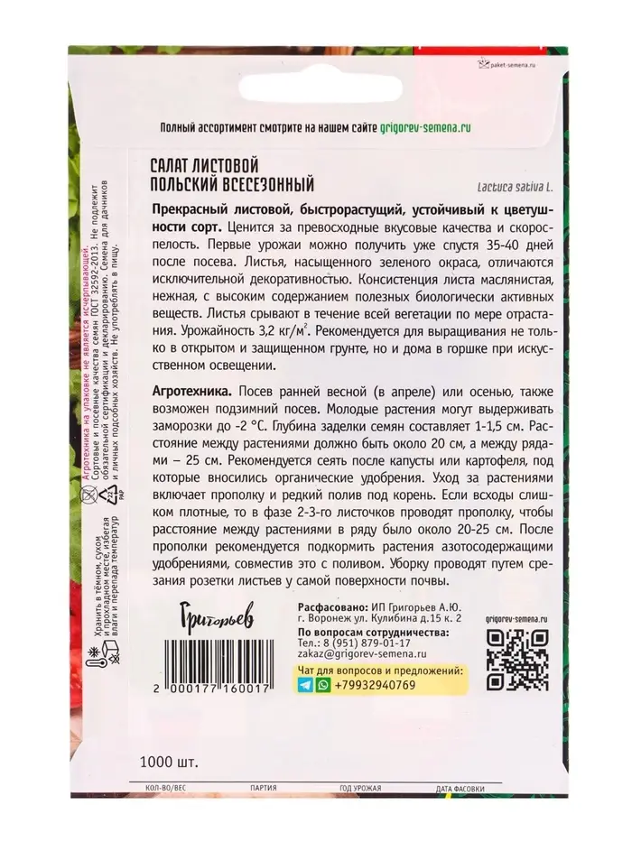 Семена Салат Польский Всесезонный листовой 1000 шт. 12.29 г.