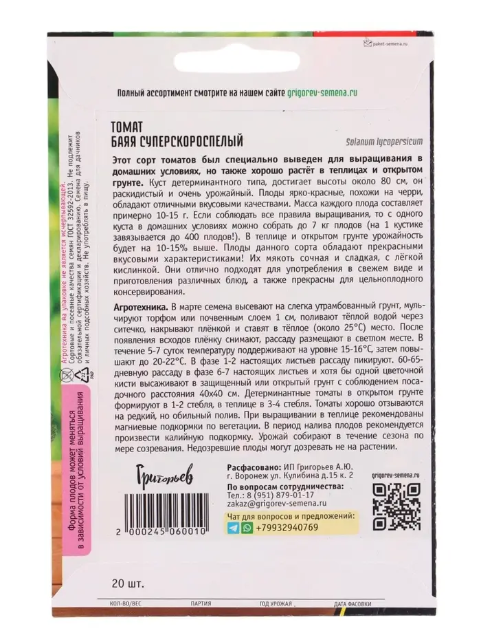 Семена Томат Баяя суперскороспелый 20шт. 12.29 г.