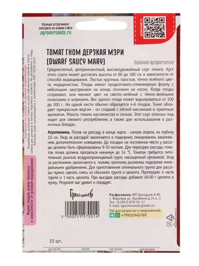 Семена Томат Гном Дерзкая Мэри (Dwarf Saucy Mary) 10шт. 12.29 г.