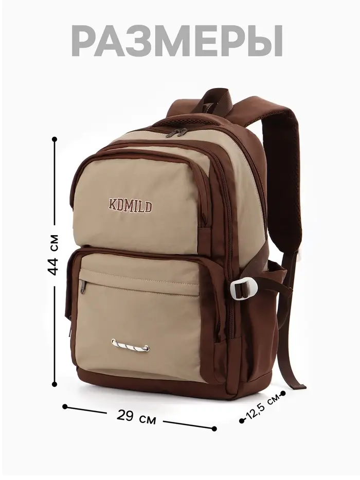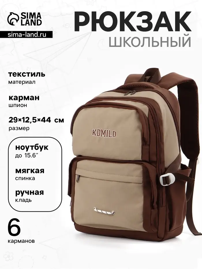 Рюкзак школьный, 2 отделения, 6 карманов, 29×12.5×44 см, коричневый