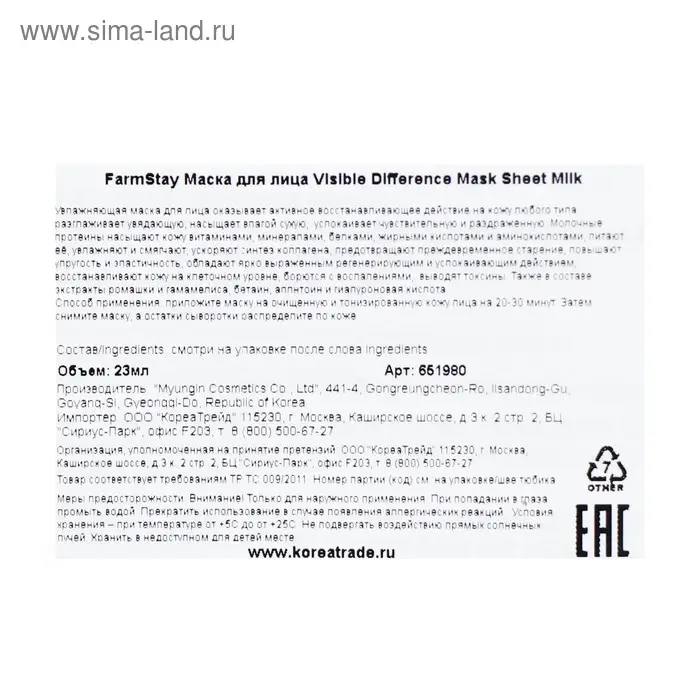 Тканевая маска с молочными протеинами Farmstay, 23 мл