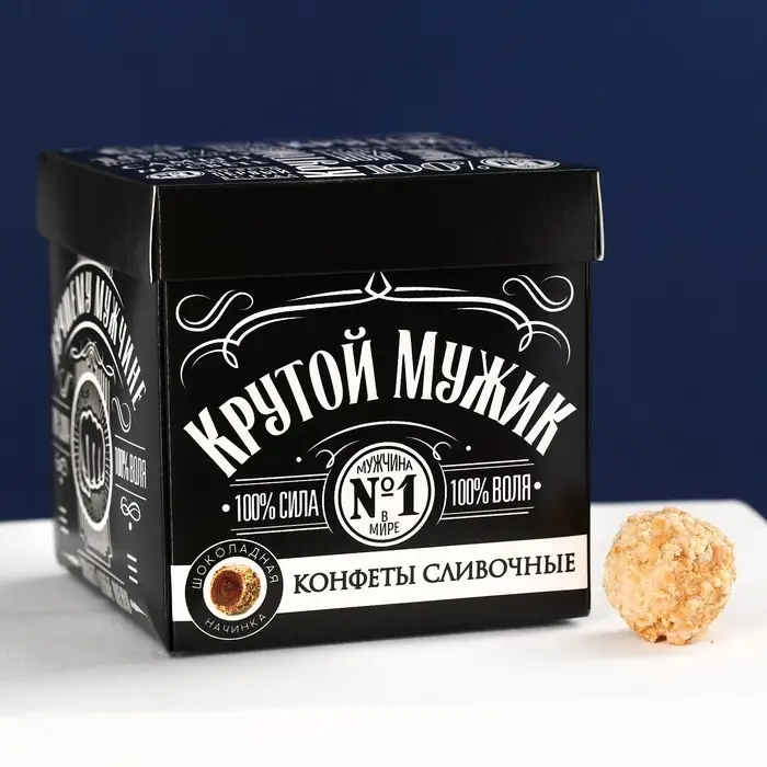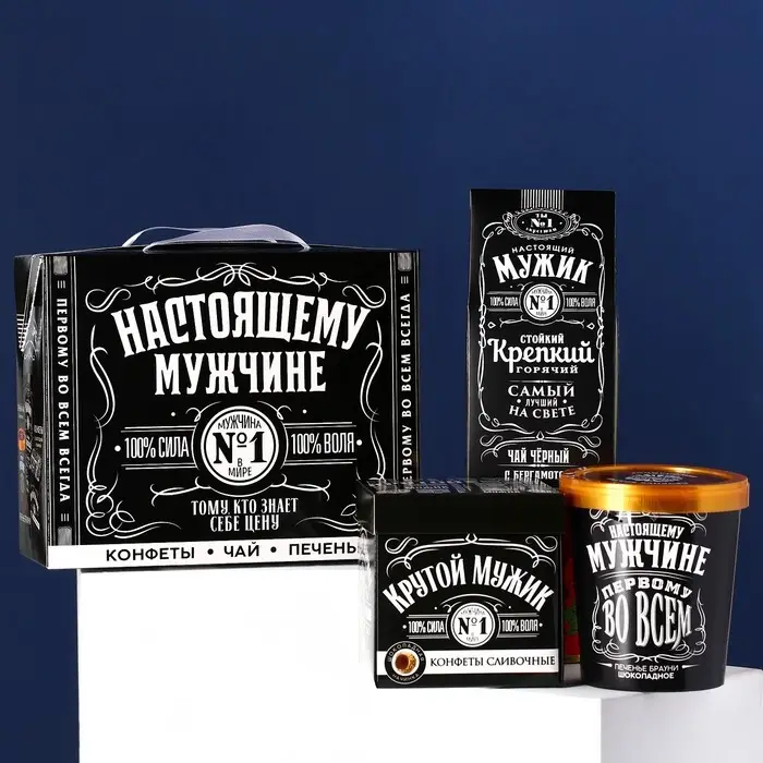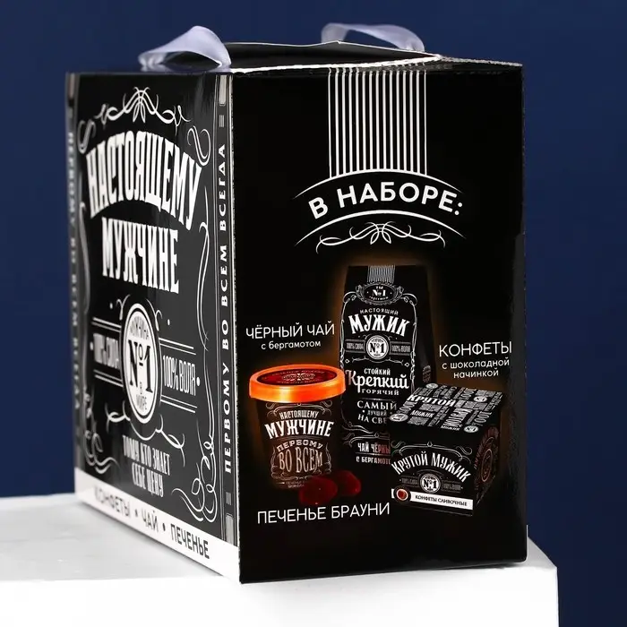Подарочный набор «Настоящему мужчине»: чай чёрный с бергамотом 50 г., печенье брауни 120 г., конфеты с шоколадной начинкой 110 г.