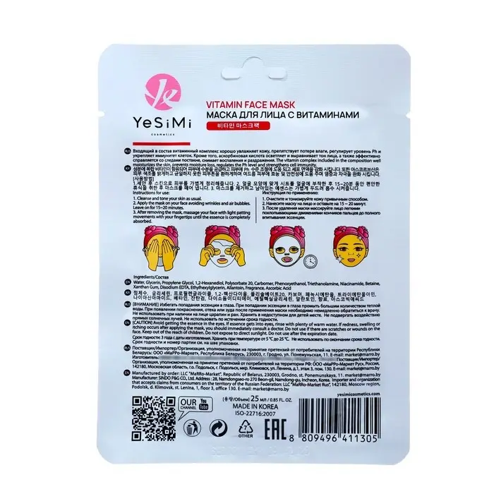 Маска тканевая для лица YeSiMi с витаминами, 25 мл