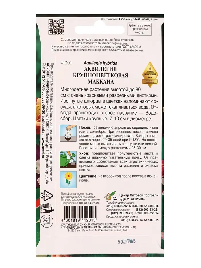 Набор семян Аквилегия многолетняя крупноцветковая Маккана, 50 семян