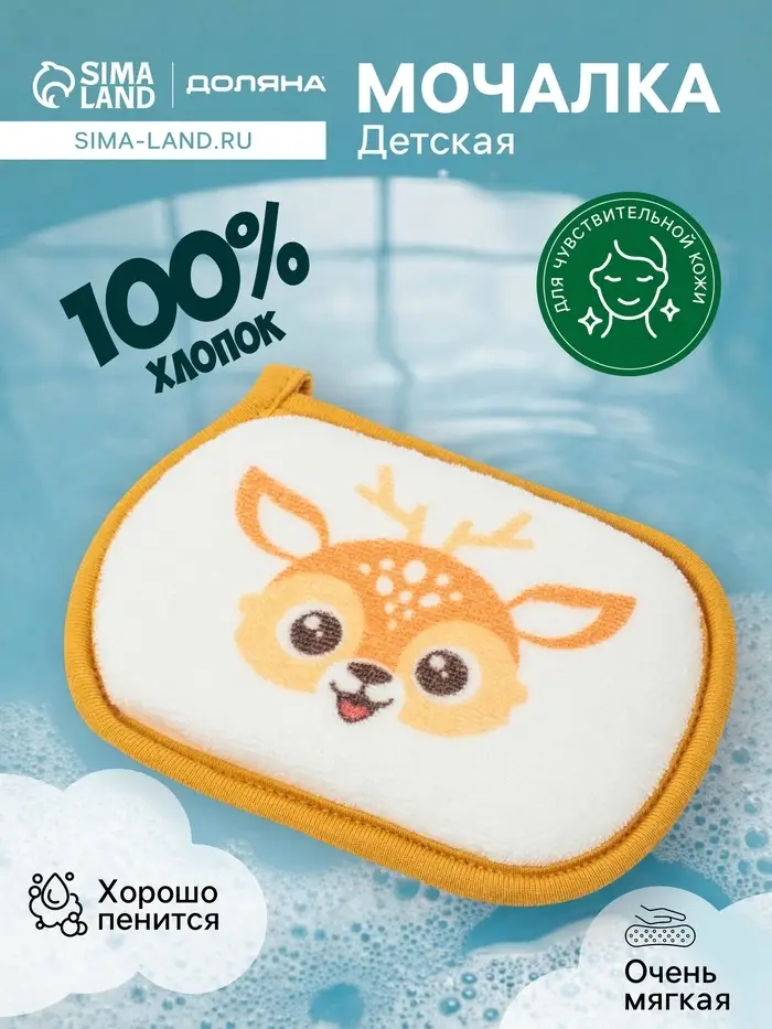 Тёплый коричневый оленёнок напоминает о лесной сказке. Эта детская губка приносит в ванную комнату уютную, природную историю. Мягкий хлопок натурального оттенка бережно очищает кожу, а образ доброго лесного жителя создаёт спокойную и доверительную атмосферу для вечернего купания.