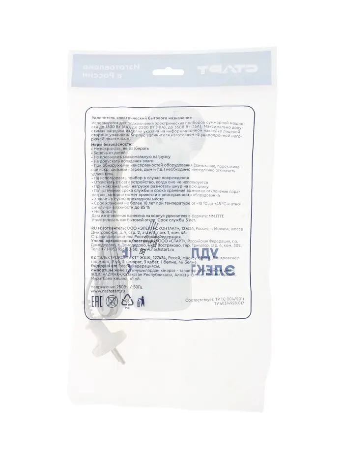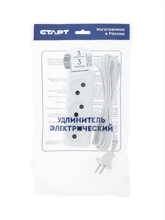 Удлинитель СТАРТ УХ6-103, 3 розетки, 3 м, 6 А, ШВВП, с заземлением, белый