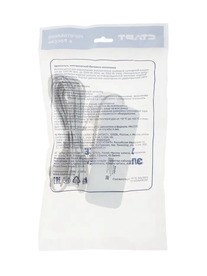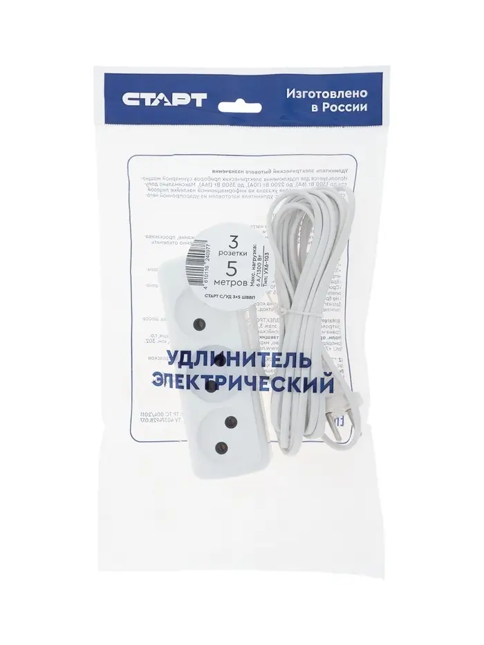 Удлинитель СТАРТ УХ6-103, 3 розетки, 5 м, 6 А, ШВВП, с заземлением, белый