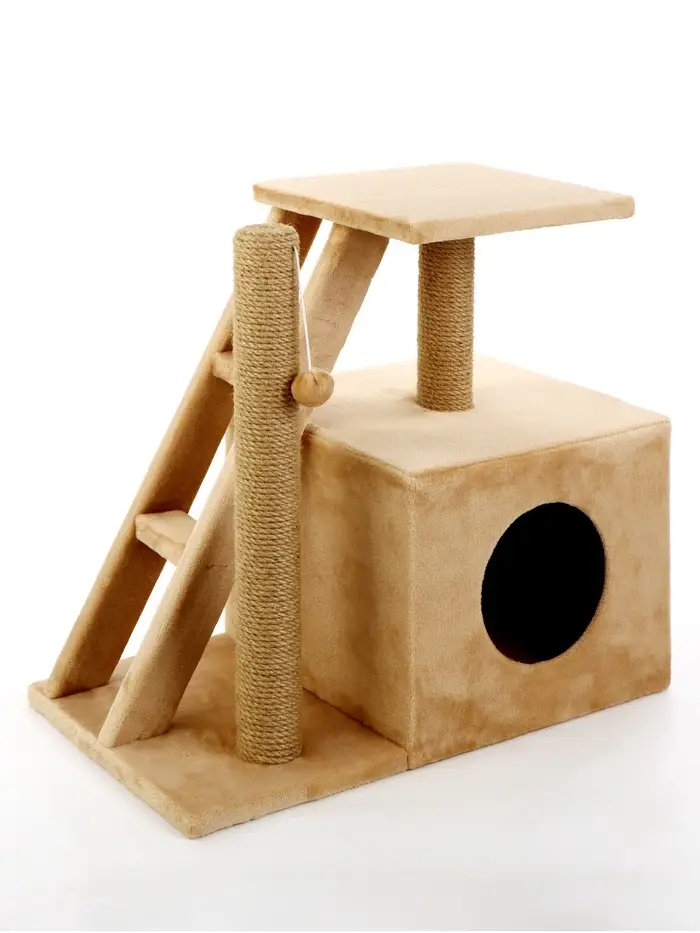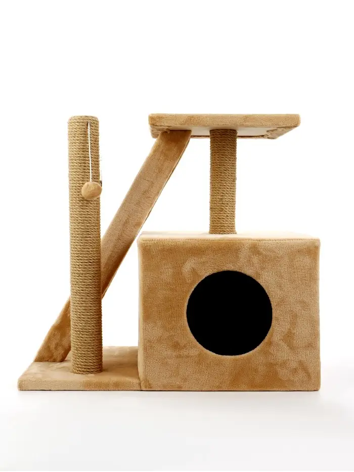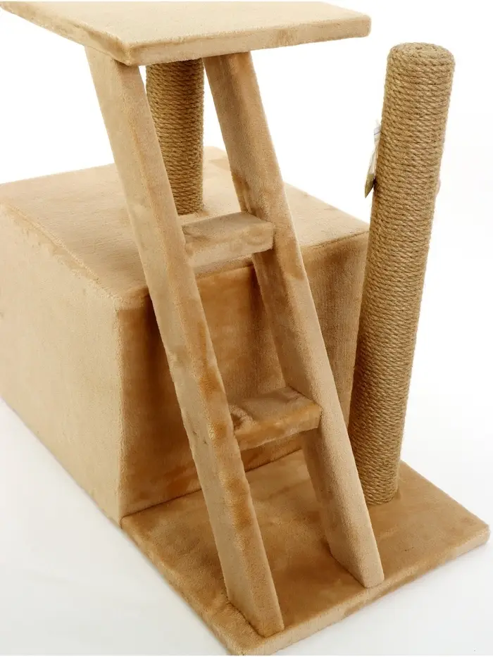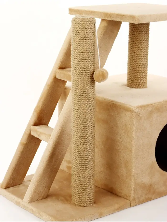 - Многоуровневая конструкция: Прочная лестница ведёт на удобную площадку-полку, где кошка может наблюдать за происходящим в комнате. Внутренний домик служит идеальным укрытием для спокойного сна и чувства защищённости.