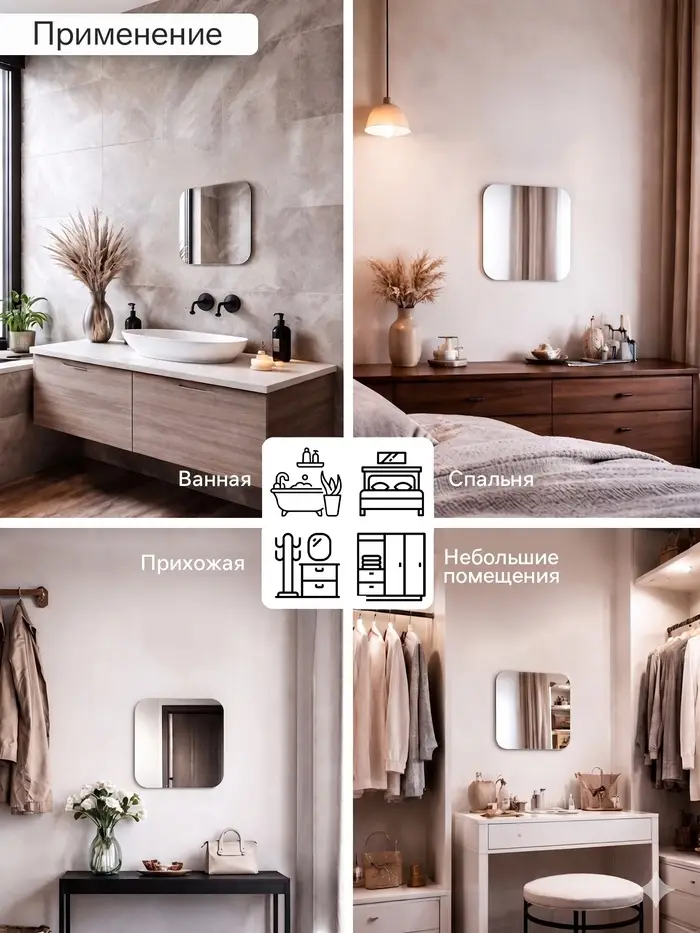 - Универсальность применения: идеально подходит для прихожей, ванной комнаты, гостиной или спальни. Может использоваться как самостоятельный элемент или в составе модульной композиции из нескольких зеркал.
