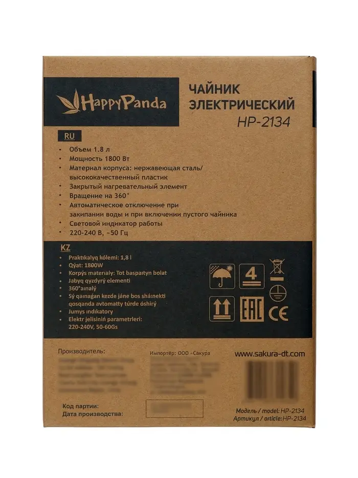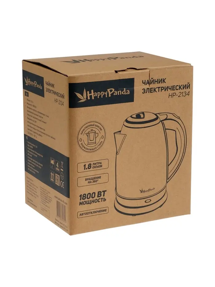 Чайник электрический Happy panda HP-2134, металл, 1.8 л, 1800 Вт, серый