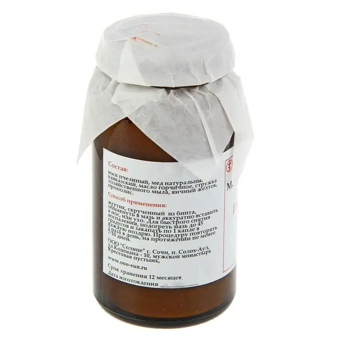 Состав: воск пчелиный, мёд натуральный кавказский, масло горчичное, стружка хозяйственного мыла, яичный желток, прополис.