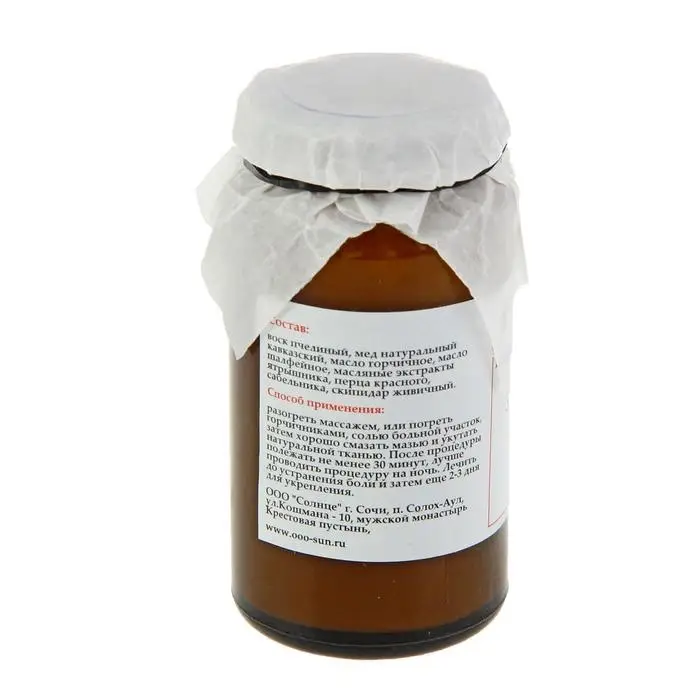 Состав: воск пчелиный, мёд натуральный кавказский, масло горчичное, масло шалфейное, масляные экстракты ятрышника, перца красного, сабельника, скипидар живичный.