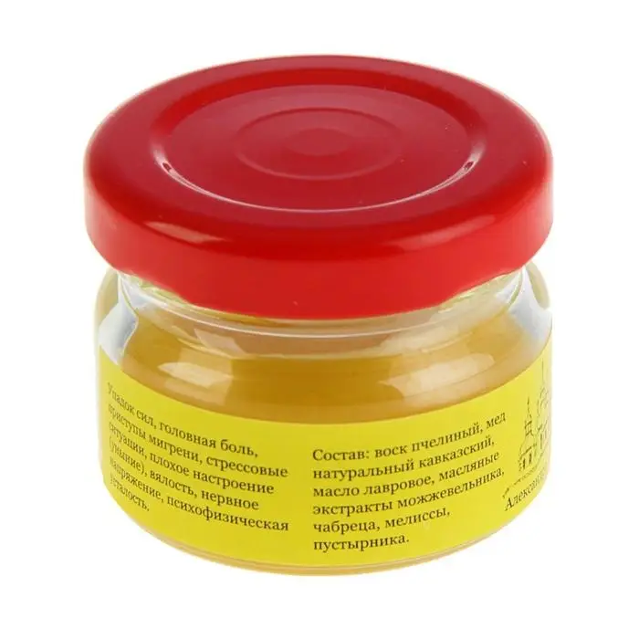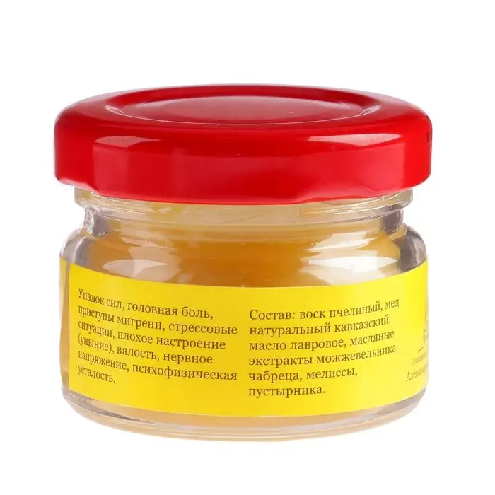 Состав: воск пчелиный, мёд натуральный кавказский, лавровое масло, можжевельник, масляный экстракт кавказских трав.