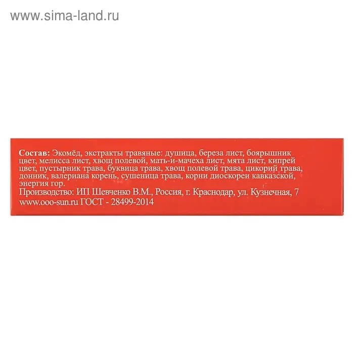Состав: кавказский высокогорный мед, экстракты медовые: душица, листья берёзы, цветы боярышника, листья мелиссы, полевой хвощ, листья мать-и-мачехи, листья мяты, цветы кипрея, пустырник, буквица, полевой хвощ, цикорий, донник, корень валерианы, сушеница, корень диоскореи.