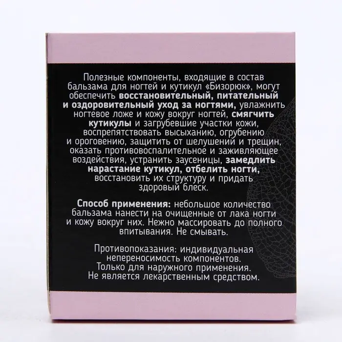 Органический бальзам «Бизорюк» оказывает восстановительное, питательное и оздоровительное действие на ногти и кутикулы. Благодаря целебным растительным компонентам средство эффективно увлажняет ногтевое ложе и кожу вокруг ногтей, смягчает кутикулы и загрубевшие участки эпидермиса, препятствует его высыханию, огрубению и ороговению, защищает от шелушения и трещин.