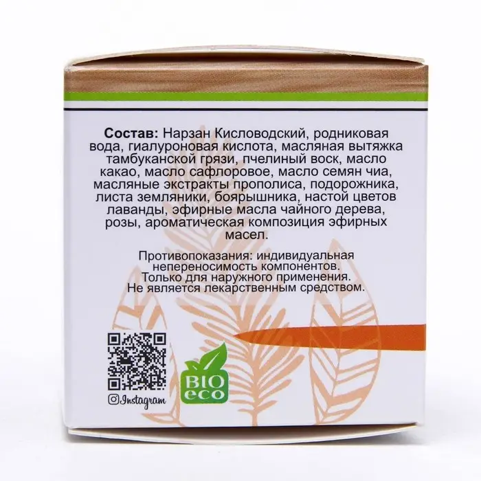 Состав: нарзан кисловодский (скважина 7-РЭ), вода родниковая, гиалуроновая кислота НА-TLM 200-400KDa, масляная вытяжка целебной тамбуканской грязи, белый воск, масло какао, масло сафлоровое, масло семян чиа, масляные экстракты: прополиса, подорожника, листа земляники, боярышника, настой цветов лаванды, эфирные масла чайного дерева, розы, ароматическая композиция эфирных масел.