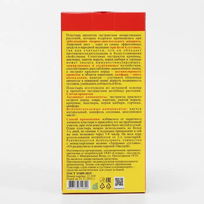 Пластырь пропитан экстрактами лекарственных растений, которые издревле применялись при заболеваниях опорно-двигательного аппарата. Лавровый лист – одно из самых эффективных средств в народной медицине при боли в суставах, так как считается, что он обладает противовоспалительными и болеутоляющими свойствами. Сочетание экстрактов крапивы, маклюры, пантов марала, корня имбиря и горчицы может оказать иммуностимулирующее, заживляющее и согревающее воздействия, способствовать расслаблению защемлённых мышц, а экстракт красного перца – активизировать кровоток в области нанесения, камфора – снять воспаления, каштан – улучшить обменные процессы в хрящевой ткани, вернуть подвижность суставов, уменьшить отёчность и боль.