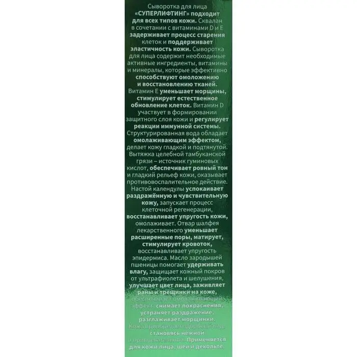 Сыворотка для лица «Суперлифтинг» - подходит для всех типов кожи. Сквалан в сочетании с витамином D и E задерживает процесс старения клеток и поддерживает эластичность кожи. Сыворотка для лица содержит необходимые активные ингредиенты, витамины и минералы, которые эффективно способствуют омоложению и восстановлению тканей. Лёгкая по структуре и быстро впитывающаяся, сыворотка обогащена гиалуроновой кислотой, которая поддерживает синтез коллагена, сохраняет влажность кожи, способствуя омолаживающим эффектам. Витамин Е уменьшает морщины, стимулирует естественное обновление клеток. Витамин D участвует в формировании защитного слоя кожи и регулирует реакции иммунной системы. Гидроксиэтилцеллюлоза – натуральный загуститель, который исключительно хорошо воспринимается кожным покровом и является идеальным ингредиентом для создания сывороток. Структурированная вода обладает омолаживающим эффектом, делает кожу гладкой и подтянутой. Вытяжка целебной тамбуканской грязи - источник гуминовых кислот, обеспечивает ровный тон и гладкий рельеф кожи, оказывает противовоспалительное действие. Настой календулы успокаивает раздражённую и чувствительную кожу, запускает процесс клеточной регенерации, восстанавливает упругость кожи, омолаживает. Отвар шалфея лекарственного уменьшает расширенные поры, матирует, стимулирует кровоток, восстанавливает упругость эпидермиса. Масло зародышей пшеницы помогает удерживать влагу, бережет кожный покров от ультрафиолета и шелушения, улучшает цвет лица, заживляет раны и трещинки на коже, обеспечивает омолаживающий эффект, снимает покраснения, устраняет раздражение, разглаживает морщинки. Каприлик/каприк триглицериды считается отличным смягчающим косметическим ингредиентом, способствующим питанию и восстановлению повреждённой кожи, а также улучшающим физико-химические свойства косметических продуктов. Сорбат калия – это природный безопасный для здоровья человека консервант, увеличивающий срок годности продуктов, обладает сильным антибактериальным и антистрессовым действием, является катализатором обмена веществ. Ароматическая композиции эфирных масел оказывает положительное влияние на эмоциональное состояние. Кожа приобретает здоровый вид, становясь нежной и привлекательной. Применяется для кожи лица, шеи и декольте.
