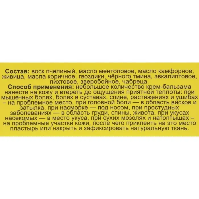 Состав: воск пчелиный, масло ментоловое, масло камфорное, живица, масла коричное, гвоздики, чёрного тмина, эвкалиптовое, пихтовое, зверобойное, чабреца.