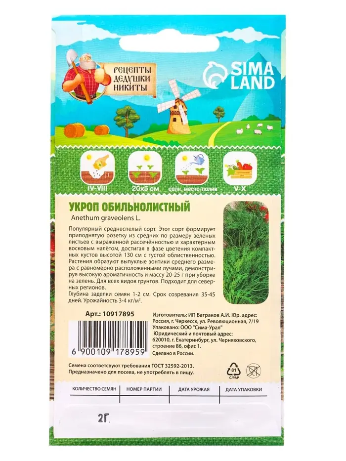 Семена Укроп «Обильнолистный», 2 г, «Рецепты дедушки Никиты»