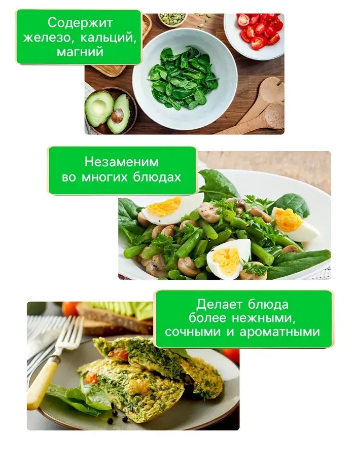 - Нейтральный вкус и кулинарная универсальность: Вкус шпината мягкий, освежающий, с легкой сладостью и почти без горечи. Молодые листья идеальны для свежих салатов, зеленых коктейлей и смузи. Более взрослые листья тушат, добавляют в супы, омлеты, пироги и соусы, используя как полезный гарнир.