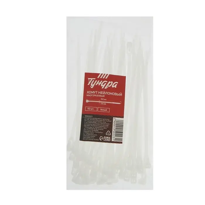 Хомут нейлоновый для стяжки, ТУНДРА, многоразовая, 3,6х150 мм, белый, 50 шт