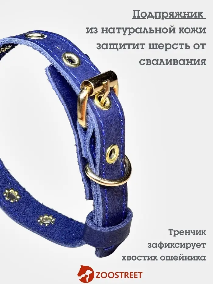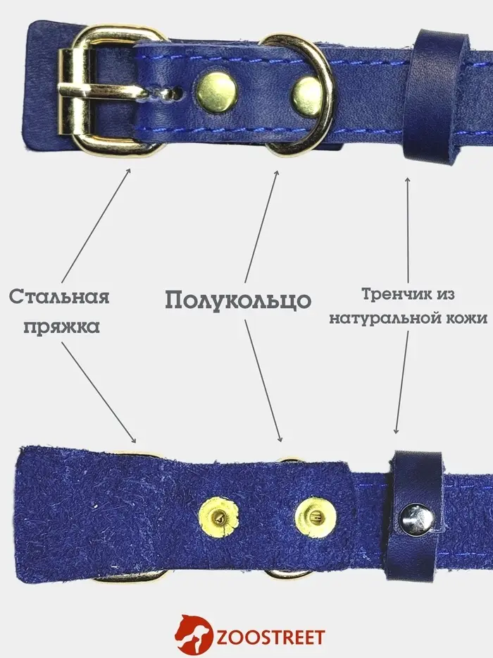 Ошейник из натуральной кожи— это универсальный повседневный аксессуар шириной 2 см, выполненный из натуральной кожи в глубоком синем оттенке. Регулируется по обхвату шеи от 11 до 35 см, подходя как для средних пород.
