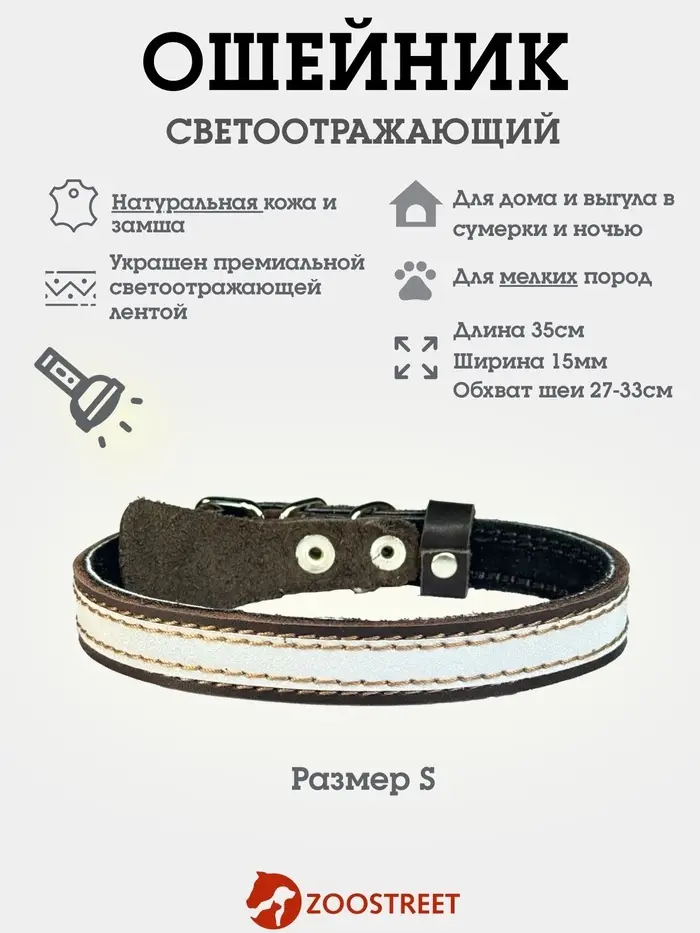 Ошейник, в котором классика встречается с заботой — для надёжных прогулок в любое время суток. Кожаный ошейник с подкладом и светоотражающей лентой выполнен в тёплом коричневом оттенке. Ширина 3,5 см и регулируемый обхват шеи 27–33 см делают его подходящим для мелких пород.
